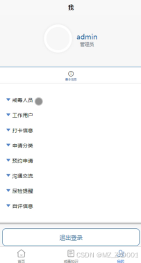 在我的界面中,基本信息,用户可以在此模块查看和编辑自己的基础信息,包括姓名、性别、年龄等,确保个人信息的准确性和实时性。添加戒毒人员和工作用户,打卡信息模块记录了用户的日常打卡情况,包括打卡时间、地点等,申请分类,用户可以根据自身需求,在此模块中选择不同类型的申请,如请假、外出等,简化申请流程。预约申请模块允许用户提前预约与工作用户的会面或咨询,提高服务效率和用户体验。沟通交流此模块为用户提供了一个与社区其他成员进行交流的平台,用户可以分享经验、寻求帮助或提供支持。尿检提醒功能会定期提醒用户进行尿检,确保戒毒过程的透明度和有效性。管理员可以在自评信息模块中查看戒毒人员填写的自评信息,了解自身在戒毒过程中的心理状态和进步情况,管理员我的界面如下图5-10所示: