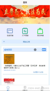 - 首页:首页是戒毒人员使用微信小程序的起点,也是他们获取信息和服务的窗口。在这里,戒毒人员可以一览无余地看到最新的戒毒知识、公告信息以及他们的打卡情况。首页设计简洁明了,功能分类清晰,方便戒毒人员快速找到他们需要的内容。