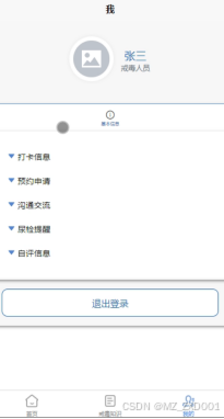 戒毒人员在我的界面可以查看和管控基本信息,包括打卡信息、预约申请、沟通交流、尿检提醒、自评信息。戒毒人员我的界面如下图5-8所示: