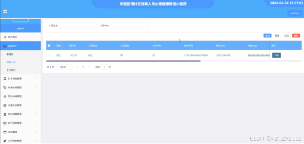 - 系统用户:系统用户管理模块允许管理员查看、编辑、删除、添加社区戒毒人员心理健康微信小程序中的用户信息。管理员可以根据需要,对用户进行分组、设置权限,以确保系统的安全和稳定。此外,管理员还可以监控用户的登录和活跃情况,为优化用户体验提供数据支持。