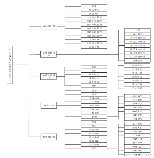 社区戒毒人员心理健康微信小程序我划分为了戒毒人员模块和管理员模块、工作用户这三大部分。