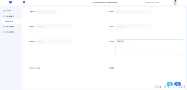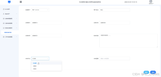 租借设备管理模块:普通用户在设备信息页面可以提交租借信息,管理员进行审核并进行设置订单信息。普通用户租借设备提交界面如下图所示。