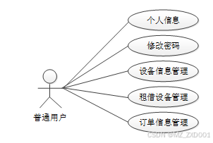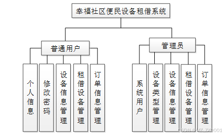 幸福社区便民设备租借系统可以划分为注册普通用户和管理员模块两大部分。