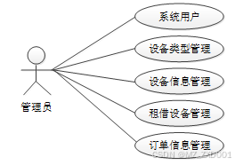 管理员模块提供了登录功能,并可对系统用户进行管理,包括管理员和普通用户。管理员可以管理设备的类型和设备信息,支持查询和添加新的设备类型和设备信息数据。管理员还可以管理用户提交租借设备申请进行审核回复并处理。在订单信息模块还可以对订单信息进行支付信息设置。具体功能模块包括系统用户、设备类型管理、设备信息管理、租借设备管理、订单信息管理。