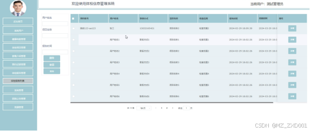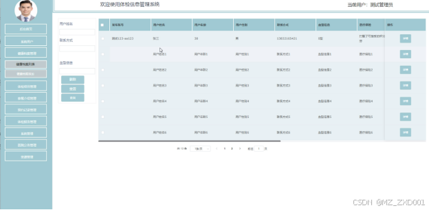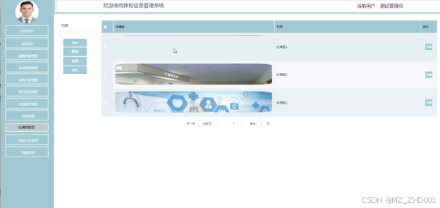 (5)体检报告管理:进入后台首页工具栏点击“体检报告管理”这个按钮可以查看所有体检报告信息,可以进行详情查看、删除、添加等操作。