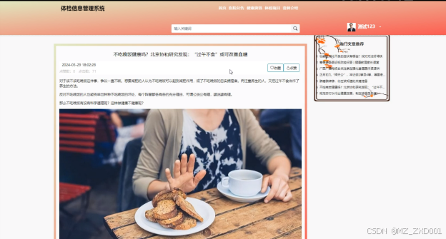 (3)健康资讯:当用户点击“健康资讯”这一菜单按钮,会显示管理员在后台发布的所有的健康资讯信息,可以查看详情;