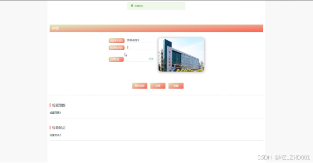 (4)体检项目:当用户点击“体检项目”这一菜单按钮,会显示管理员在后台发布的所有的体检项目,可以查看详情,进行预约体检、收藏、点赞、评论等;