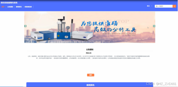 首页:展示实验室预约系统的最新公告通知、新闻资讯,以及实验室的基本信息和预约状态概况。