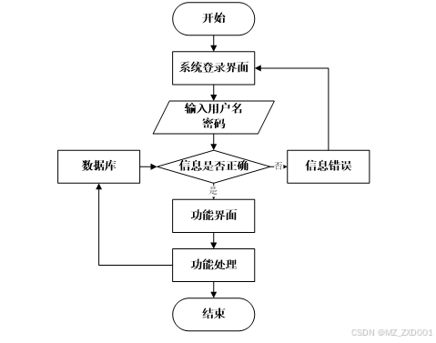 用户打开并进入系统后,会先显示登录界面,输入正确的用户名和密码,系统自动检测信息,若信息无误,则用户会进入系统功能界面,进行操作,否则会提示错误无法登录,操作流程如图2-5所示。