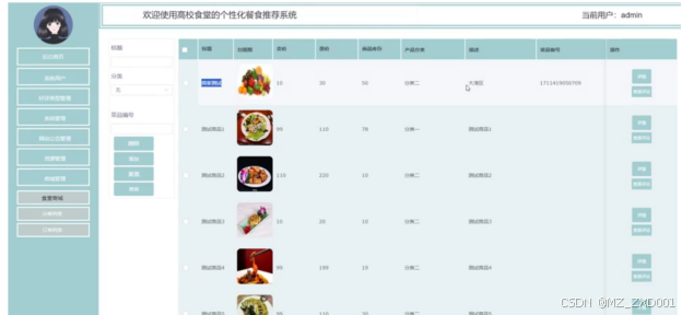 - 商城管理:管理员可以在商城管理下查看食堂商场、分类列表、订单列表进行设置,添加,修改和删除操作。