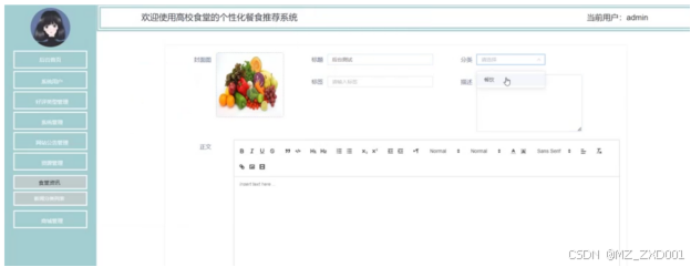 - 资源管理:管理员可以查看食堂资讯及新闻分类列表,进行编辑分类等操作。