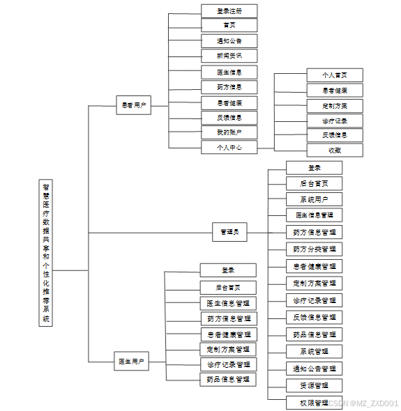 按照智慧医疗数据共享和个性化推荐系统的角色,主要包括患者用户模块、医生用户模块和管理员模块,其主要内容如下: