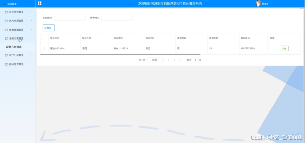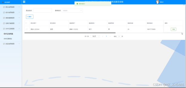 (6)定制方案管理:医生用户可以管理定制方案,包括列表查看、查询和查看详细信息。医生用户可以通过医生姓名和患者姓名进行搜索。