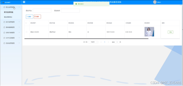 (3)医生信息管理:医生用户在后台可以进行医生信息的列表查看、添加新信息、进行查询、删除已有信息、以及查看详细信息。此外,医生用户可以通过医生专业或姓名进行搜索。