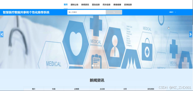 (2)首页:可以查看系统导航栏,轮播图,通知公告、新闻资讯、医生信息、推荐药方信息。