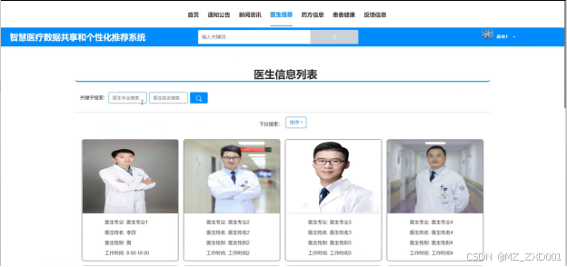 (5)医生信息:患者用户可以浏览医生信息列表,包括医生的专业、姓名、性别、工作时间等,也可以根据医生专业或姓名进行搜索。此外,用户可以对喜欢的医生进行点赞、收藏,并发表评论。