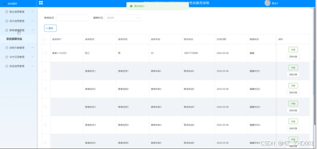 (7)患者健康管理:管理员可以管理患者健康信息,包括列表查看、添加、查询、删除、查看详细信息,以及管理定制方案等操作。管理员可以通过患者姓名和健康状态进行搜索。