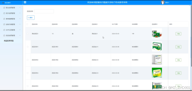(8)药品信息管理:医生用户可以管理药品信息,包括列表查看、查询和查看详细信息。医生用户可以通过药品名称进行搜索。
