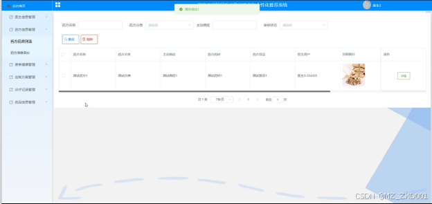 (4)药方信息管理:医生用户可以管理药方信息,包括列表查看、添加新药方、查看详细信息、进行查询和删除操作。医生用户还可以通过药方名称、分类、主治病症以及审核状态进行搜索。