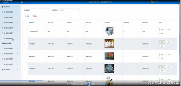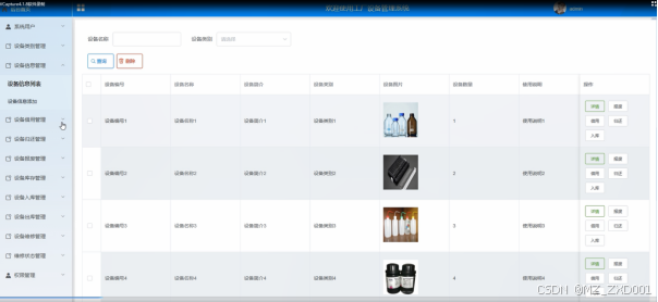 管理员点击“设备库存管理”按钮可以查看到企业的设备库存列表信息,包括设备编号、设备名称、设备简介、设备类别、设备图片、设备数量、使用说明等信息,并且可以进行出库和入库。同时也支持对已有的设备库存列表进行查询、删除等操作。界面如下图所示。