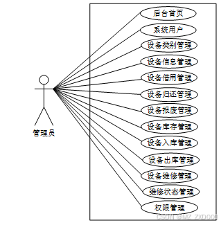 工厂设备管理系统中管理员角色功能包含了后台首页、系统用户、设备类别管理、设备信息管理、设备借用管理、设备归还管理、设备报废管理、设备库存管理、设备入库管理、设备出库管理、设备维修管理、维修状态管理、权限管理,管理员的用例图如图2.1所示: