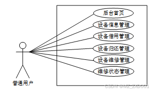 工厂设备管理系统中普通用户角色功能包含了后台首页、设备信息管理、设备借用管理、设备归还管理、设备维修管理、维修状态管理,普通用户的用例图如图2.1所示: