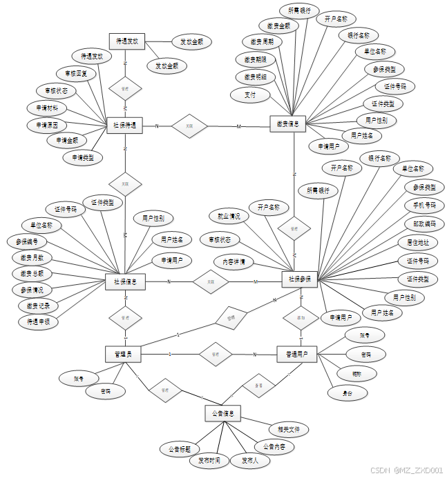 下面是整个市社保局社保信息管理与分析系统中主要的数据库表总E-R实体关系图。