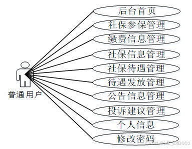 根据市社保局社保信息管理与分析系统的角色需求分析,可以划分为普通用户和管理员两大模块。其中普通用户具有后台首页、社保参保管理、缴费信息管理、社保信息管理、社保待遇管理、待遇发放管理、公告信息管理、投诉建议管理、个人信息、修改密码等功能,能够对自己社保参保、缴费、待遇等信息进行搜索、查看和管理,并可以进行投诉建议;而管理员则拥有后台首页、系统用户(管理员、普通用户)、社保类型管理、社保参保管理、缴费信息管理、社保信息管理、社保待遇管理、待遇发放管理、公告信息管理、投诉建议管理等功能,及时更新系统相关信息,维护系统的正常运转