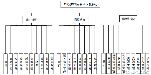 按照宠物之家管理系统的角色,我划分为了用户模块、商家模块及管理员管理模块这三大部分。
