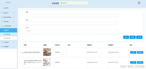(2)资源管理:进入后台首页工具栏点击“资源管理”这个按钮可以查看所有新闻列表、分类列表等信息,可以进行详情查看、删除、查看评论等操作。
