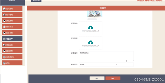 (7)资源分享:资源分享:主页面展示资源分享列表,能根据资源名称、资源类型进行关键字搜索,支持新增、删除、编辑、查看、重置查询条件操作以及查看资源详细信息、查看评论以及审核用户提交的资源分享。可点击下载资源附件,点击播放可播放资源视频。