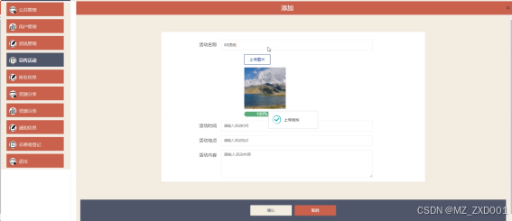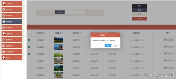 宣传活动:宣传活动:主页面展示宣传活动列表,能根据活动名称进行关键字搜索,支持新增、删除、编辑、查看、重置查询条件操作以及查看店铺门面详情、查看评论。宣传活动可输入:活动名称、上传图片、活动时间、活动地点、活动内容信息点击确认即可新增。新增后将会在前端页面展示。宣传活动删除如图5-8所示。宣传活动添加如图5-9所示。