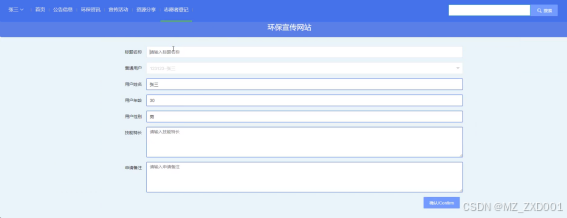 (8)志愿者登记:登记志愿者信息,输入标题名称、技能特长、申请备注,点击确认即可提交。