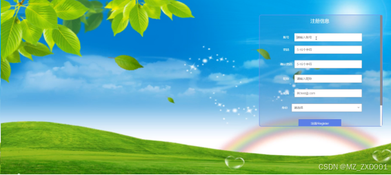 (1)用户注册:普通用户注册:在用户注册页面中填写好账号、设置密码、确认密码、昵称、邮箱、选择身份、用户姓名、用户性别等字段值,点击下方注册按钮,提示注册成功后,系统将自动跳转回到首页。
