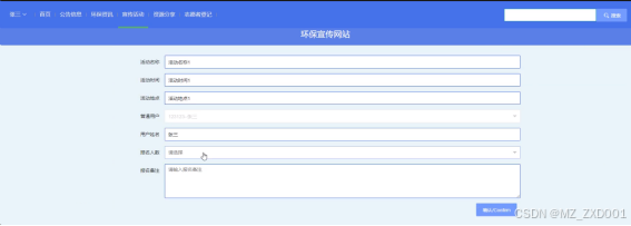 宣传活动:展示发布的宣传活动,可进行活动名称关键字搜索、下拉搜索并可重置查询条件,能对列表进行排序,点击宣传活动标签页可进入详细信息页面,可以参与报名,并对活动点赞、评论以及收藏,评论区查看该活动评论。宣传活动报名如图5-3所示。
