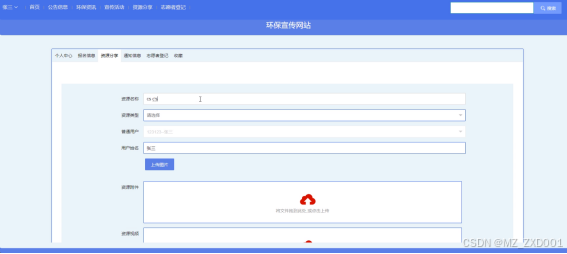 个人中心:包含报名信息、资源分享、通知信息、志愿者登记、收藏等。报名信息:用户活动报名信息;资源分享:用户分享的资源信息,支持查询、删除、新增、编辑操作,新增的分享需要管理员审核后才能在前端展示;通知信息:展示通知信息;志愿者登记:展示自愿者登记记录;收藏:展示用户所有收藏记录。新增资源分享如图5-6所示。