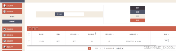 用户管理界面:主要是管理员、普通用户的管理,支持查询、重置查询、新增用户、删除用户、编辑用户、查看用户个人信息等操作,用户管理如图5-7所示。