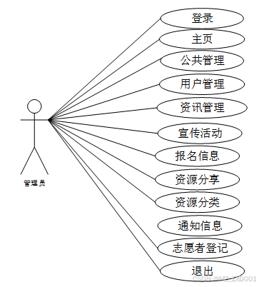 PHP环保宣传网站中管理员涉及登录、主页、公共管理、用户管理、资讯管理、宣传活动、报名信息、资源分享、资源分类、 通知信息、志愿者登记等,管理员对应的用例图如图3.2所示: