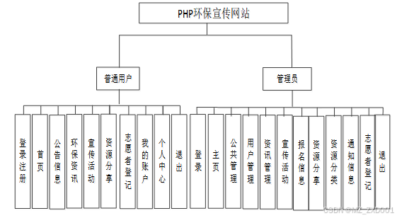 PHP环保宣传网站包含普通用户、 管理员两个角色划分,每个角色对应的主要功能如下: