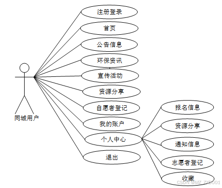PHP环保宣传网站中普通用户包含注册、登录、首页、公告信息、环保资讯、宣传活动、资源分享、志愿者登记、我的账户、个人中心等功能,对应角色用例图如图3.1所示: