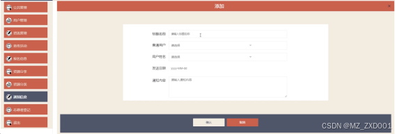 (9) 通知信息:展示所有通知内容,可通过用户姓名进行过滤。可重置过滤条件、删除通知、新增通知。输入标题名称、普通用户、用户姓名、发送日期、通知内容,点击确定后可以新增通知信息,并发送给对应用户。