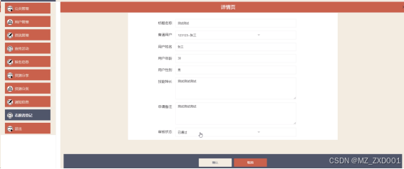 (10)自愿者登记:志愿者登记:展示用户提交的志愿者登记信息,可通过标题名称、用户姓名进行过滤。可重置过滤条件、支持增删改操作并可对志愿者登记进行审核。
