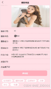 - 摄影作品:在摄影作品模块,用户可以浏览系统中上传的各类摄影作品,包括人像、风景、宠物等不同主题的作品。用户可以对喜欢的作品进行点赞、评论、收藏以及在线预约拍摄服务。