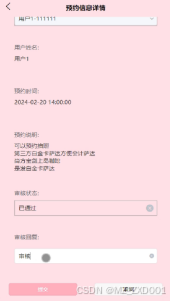 在线预约功能包括用户选择预约服务类型、时间和地点,填写相关信息如联系方式、需求等,系统确认预约信息并发送确认通知,门店用户接收预约请求并确认,系统生成预约订单。用户可在系统中查看预约状态和详情,便捷管理预约服务。在线预约功能提供了便捷的服务体验,节省用户时间和精力,提升了系统的用户友好性和服务质量。界面如下图所示。