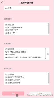用户可在作品详情页进行在线预约拍摄服务,留下评论和评分,进行摄影拍照预约,收藏喜欢的作品,选择后期制作服务,点赞支持优秀作品。这些功能提升了用户与作品的互动体验,促进了作品展示和用户参与度,丰富了系统功能和用户体验。界面如下图所示。