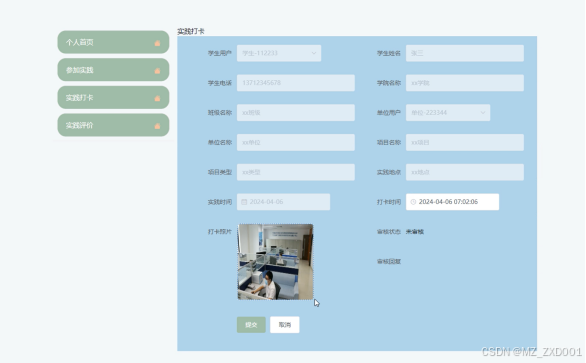 当用户点击社会实践管理系统中“个人中心”,可以查看参加实践、实践打卡、实践评价等信息,并进行相关的操作。界面如下图所示。