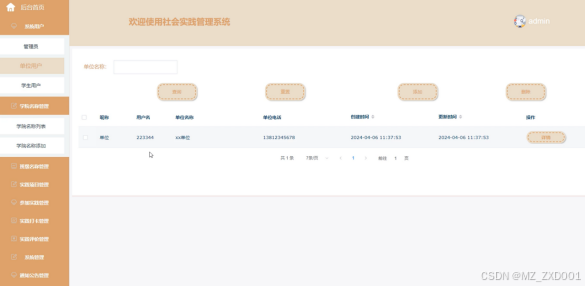 通过参加实践管理页面,管理员可以查看参加实践的学生用户、学生姓名、学生电话、单位用户、班级名称、单位名称等信息,并进行查询、重置、删除等操作,参加实践界面如下图所示。