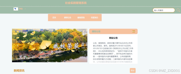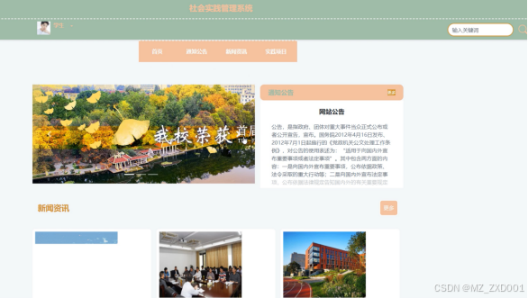 当用户进入社会实践管理系统的时候,首先映入眼帘的是系统的首页,首页展示的项目有通知公告、新闻资讯、实践项目、我的账户、个人中心(参加实践、实践打卡、实践评价)等内容,首页主界面展示如下图所示。