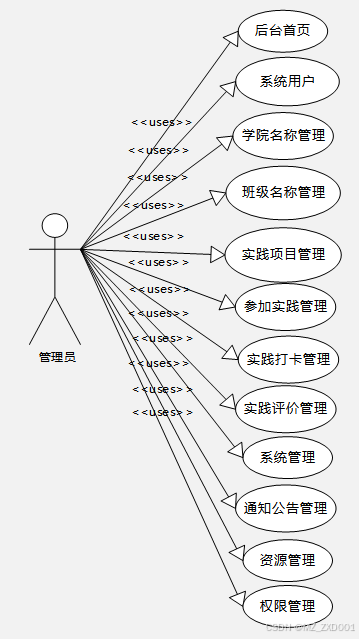 通过管理员功能页面,管理员可以查看后台首页、系统用户、学院名称管理、班级名称管理、实践项目管理、参加实践管理、实践打卡管理、实践评价管理、系统管理、通知公告管理、资源管理、权限管理等,并且可以根据需要进行相应的操作,界面如下图所示。