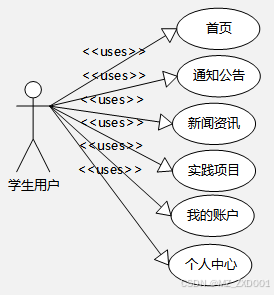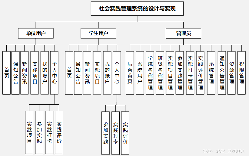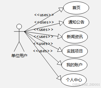 系统不仅支持用户的登录,还支持对通知公告、新闻资讯、实践项目、我的账户、个人中心等的查看,并且提交全面的数据和信息,从而满足用户需求。为用户带来更为便利的操作体验,并且通过对用户的人性化反馈,为用户带来更为全面的服务体验。根据系统功能需求建立的模块关系图如下图:
